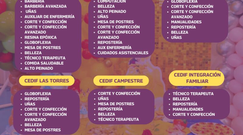 Los Centros para el Desarrollo Integral de la Familia, cuentan con una amplia variedad de opciones, que incluyen desde corte y confección, repostería, belleza, barbería y uñas, hasta cursos de salud como auxiliar de enfermería, cuidados asistenciales y técnico terapeuta.